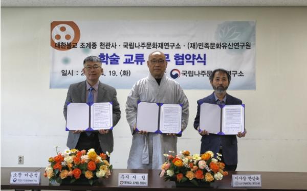 문화재청 국립문화재연구원 국립나주문화재연구소는 19일 오후 3시 국립나주문화재연구소 회의실에서 대한불교 조계종 천관사(주지스님 지행), (재)민족문화유산연구원과 함께 전남 장흥 천관사와 관련한 불교 문화유산에 대한 체계적인 조사·연구, 홍보 활성화를 위한 업무협약을 체결했다.