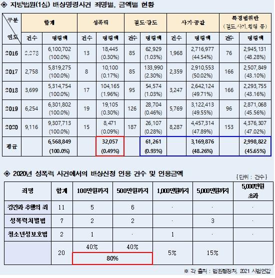 그러나, 실무 운영에 있어 배상명령 사건의 신청 및 처리가 피해액 산정이 용이한 재산범죄에 치중되고, 성범죄에 대한 인용 비율이나 인용 금액은 모두 미미한 수준에 그쳐 활용이 저조하다는 지적이 있어 왔다.