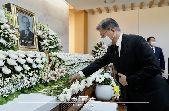 문 대통령은 빈소에 국화꽃을 헌화한 뒤 고인의 아내 김송자 여사께 “(고인은) 사회적으로도 아주 큰 어른이셨고, 또 우리 후배 변호사들 또 법조인들에게 아주 큰 귀감이 되셨던 분”이라며 “저를 아주 많이 아껴주셨는데 너무나 애통하다”고 말했다.