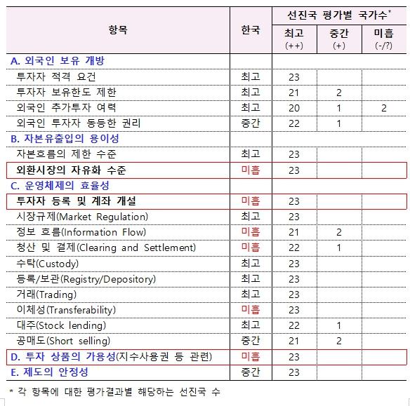 MSCI측은 한국 정부의 외환시장 선진화 등 시장접근성 제고 노력을 환영하며, MSCI의 시장접근성 평가가 글로벌 투자자의 실제 체감도를 바탕으로 이루어지는 만큼, 한국 정부가 제도개선 방안을 글로벌 투자자들에게 투명하게 공개하고, 적극적으로 소통하는 노력이 중요하다고 덧붙였다.음