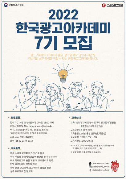 문화체육관광부는 사단법인 한국광고총연합회와 함께 실무 능력을 갖춘 예비 광고인력을 양성하기 위해 ‘한국광고아카데미 7기’를 운영한다.