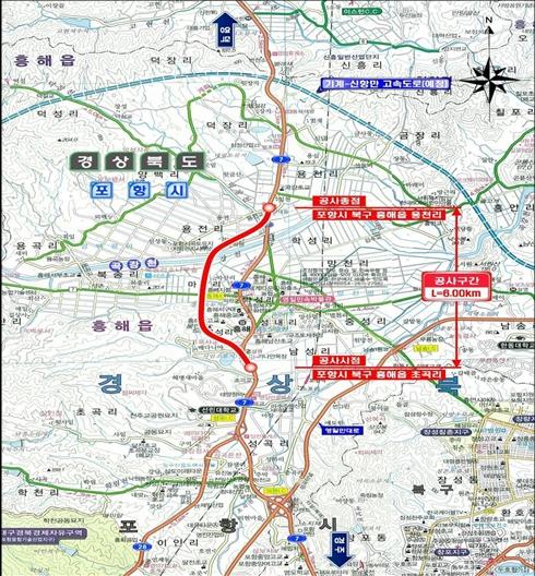 국토교통부는 국도 7호선 경북 포항시 북구 흥해읍 초곡리에서 용천리까지 총 6.0km 구간의 4차로 신설공사를 마치고 오는 4월 28일 16시부터 개통한다고 밝혔다.