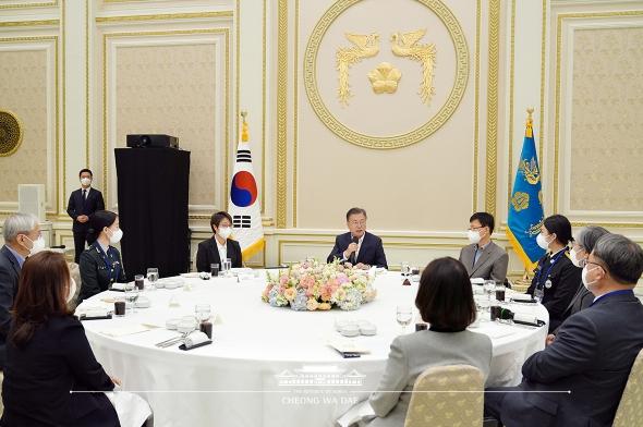 문 대통령은 오찬 간담회에서 지난 2년간 코로나19 대응을 위해 곳곳의 현장에서 헌신해 주신 분들을 모셨다며 감사의 뜻을 밝혔고, 참석자들은 방역 현장의 다양한 이야기들을 전했다.