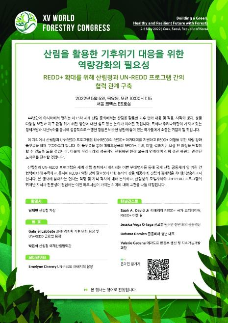 부대행사에서는 유엔환경계획의 가브리엘 라바트(Gabriel Labbate) 팀장이 "준 국가 수준의 레드플러스(REDD )의 성공요인과 잠재력; 산림의 기후위기 역량을 극대화하기 위한 역량강화의 필요성”을 주제로 발표하고, 박은식 국제산림협력관이 "한국의 성공적인 산림녹화 경험을 바탕으로 한 레드플러스(REDD ) 역량강화”를 주제로 발표한다.