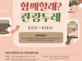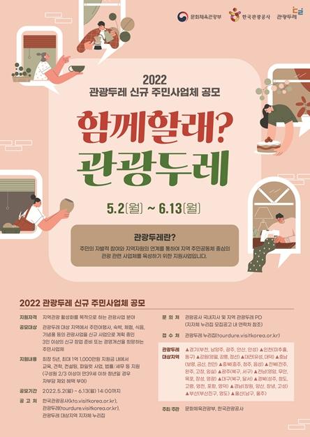 문화체육관광부는 한국관광공사와 함께 주민들이 지속 가능한 지역관광 생태계를 만들어갈 수 있도록 5월 2일(월)부터 6월 13일(월) 오후 2시까지 ‘2022년 관광두레 신규 주민사업체’를 모집한다.