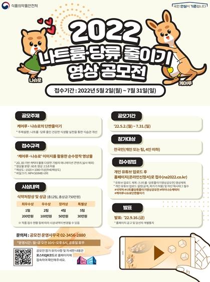 이번 영상 공모전은 누구나 참가할 수 있고 나트륨ㆍ당류 줄이기 캐릭터인 ‘케어루’와 ‘나슈로’를 활용해 2D, 3D 기반의 다양한 기법으로 제작한 60초 분량의 애니메이션 작품을 대상으로 하며, 개인 유튜브에 게시 후 공모전 누리집에서 신청 할 수 있다.