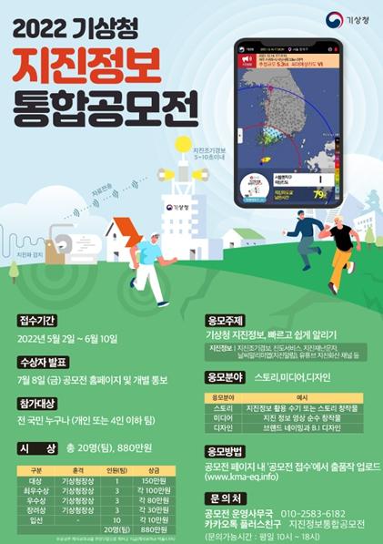 기상청은 5월 2일(월)부터 6월 10일(금)까지 국민의 지진정보에 대한 이해와 공감을 확산시키기 위해 ‘2022년 기상청 지진정보 통합 공모전’을 개최한다.