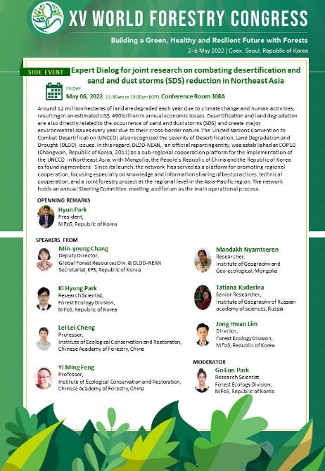 산림청 국립산림과학원은 5월 6일(금), 서울 COEX에서 진행되고 있는 제15차 세계산림총회 부대행사에서 동북아시아 사막화 방지와 황사 저감을 위한 전문가 포럼을 진행하여 공동연구 추진에 대해 논의한다고 밝혔다.