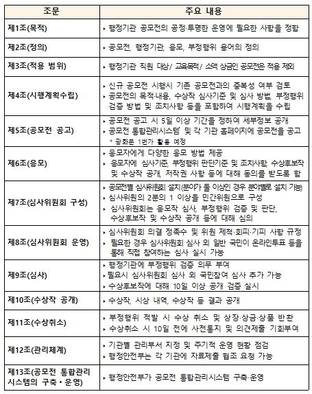 이번 행정기관 공모전 운영 규정은 중앙행정기관과 그 소속기관에 적용되며, 지자체 등에는 동 규정을 바탕으로 관련 조례를 제정·운영토록 권고하여 공모전의 공정한 운영을 확산해 나갈 계획이다.