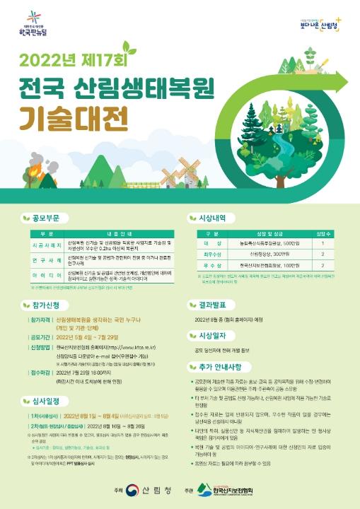 산림청은 산림복원사업의 저변 확대 및 신기술(공법)의 발굴을 위해 ‘제17회 전국 산림생태복원 기술대전’을 개최한다고 밝혔다.