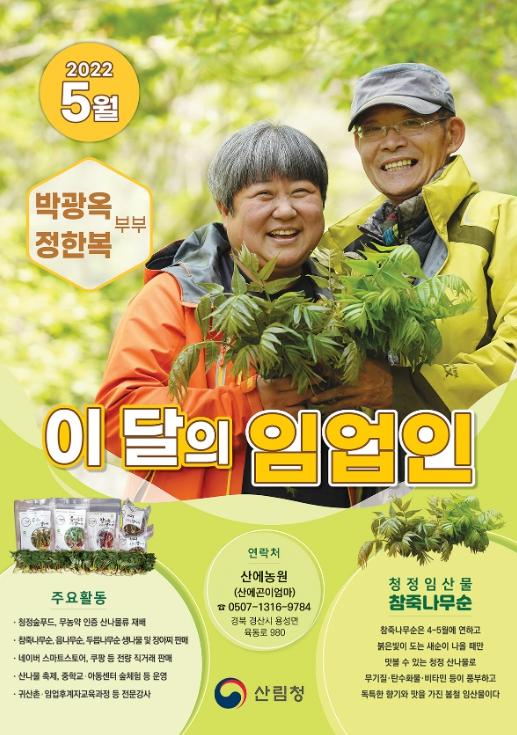 5월 ‘이달의 임업인’으로 선정된 박광옥·정한복 부부는 참죽나무순과 음나무순, 두릅나무순 등을 재배·가공하고 온라인 판매처를 적극 활용하여 판매하면서 산나물축제 등 각종 체험과 산림경영정보 교육 활동에 앞장서는 등 임산물 고부가가치와 임업의 활성화를 위해 노력하였다.