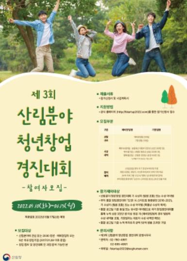 산림청은 산림분야 창업에 관심이 있거나 반짝이는 참신한 아이디어로 산림분야에 활기를 불어넣어 줄 230대 청년을 대상으로 ‘제3회 산림분야 청년창업경진대회’를 개최한다.