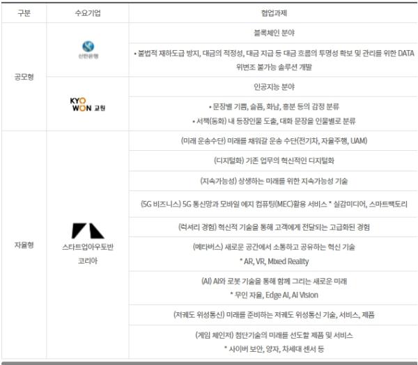 과제 유형은 대·중견기업이 해결 과제를 제시하는 ‘공모형(2개)’과, 대·중견기업이 큰 틀의 과제 분야를 제시하면 재창업기업이 구체적인 협업 사업모형(비즈니스모델)을 제안하는 ‘자율형(9개)’으로 나뉜다.
