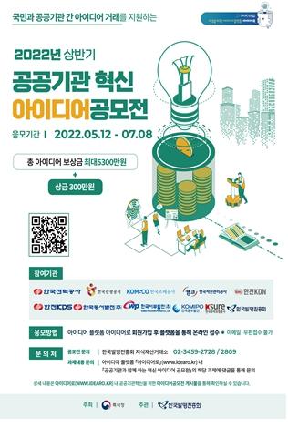 특허청은 국민과 공공기관 간의 아이디어 거래를 지원하는 2022년 상반기 "공공기관과 함께하는 혁신 아이디어 공모전"을 5월 12일부터 7월 8일까지 개최한다고 밝혔다.