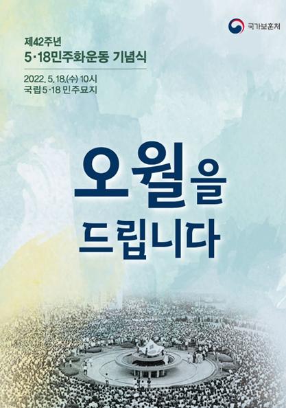 국가보훈처는 17일“대한민국 민주주의와 인권 발전에 이바지한 5·18민주화운동의 숭고한 정신을 계승·발전시키기 위해 올해로 제42주년을 맞는 5·18민주화운동 기념식을 오는 18일 오전 10시, 광주광역시 북구에 소재한 국립5·18민주묘지에서 개최한다”라고 밝혔다.