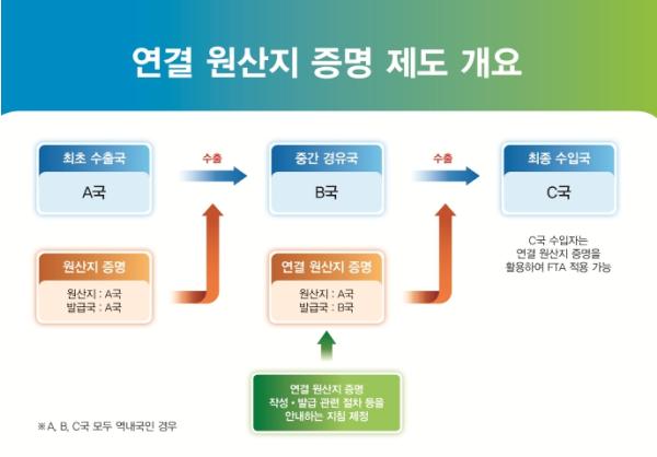 동일한 자유무역협정(FTA)을 체결한 역내국으로 재수출하는?물품은 중간 경유국에서 최초 수출국의 원산지증명에 기초해?연결 원산지증명을 작성, 발급할 수 있다.
