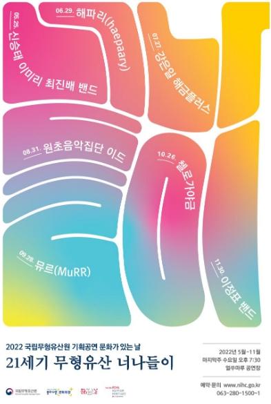 문화재청 국립무형유산원은 5월부터 11월까지 매월 마지막 주 수요일, 문화가 있는 날 저녁 7시 30분에 기획공연 '21세기 무형유산 너나들이'를 개최한다.
