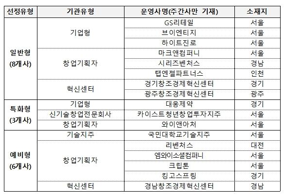 코스피 상장 기업인 ‘GS리테일’과 ‘하이트진로’가 창업기획자 등록 없이 운영사로 선정되었으며,