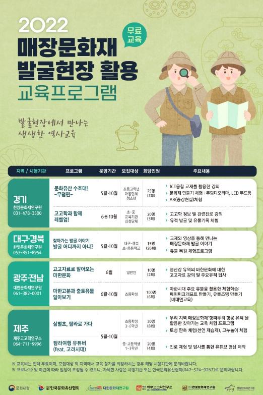 ? 경기, 대구?경북, 광주?전남, 제주 등 4개 권역에서 각 지역 매장문화재를 주제로 총 7개의 다양한 교육 프로그램이 진행된다. ▲정보통신기술(ICT)교재를 활용한 강의와 증강현실(AR)체험 등으로 이루어진 ?문화유산 수호대!-무덤편-?(경기, 한양문화재연구원), ▲매장문화재의 발굴과 복원의 전 과정을 강의와 체험으로 알아보는 ?찾아가는 발굴 이야기 : 발굴 어디까지 아니??(대구·경북, 한빛문화재연구원), ▲온라인 강의와 함께 종이 모형(페이퍼 크래프트)으로 유물을 만들어 보는 ?2000년의 시간여행, 잠자는 마한 밝히기?(광주·전남, 대한문화재연구원), ▲제주 항파두리 항몽유적 답사 및 유적을 활용한 뉴미디어 영상제작체험과 전통놀이를 배워볼 수 있는 ?삼별초, 탐라로 가다?(제주, 제주고고학연구소) 등 다채로운 교육으로 구성된다.