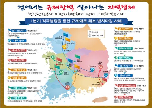 행정안전부는 지자체가 적극적인 행정을 통해 불합리한 규제를 개선하고, 지역경제 활성화 및 주민의 삶의 질 향상에 기여한 "규제애로 해소 우수사례 8건”을 선정했다고 밝혔다.