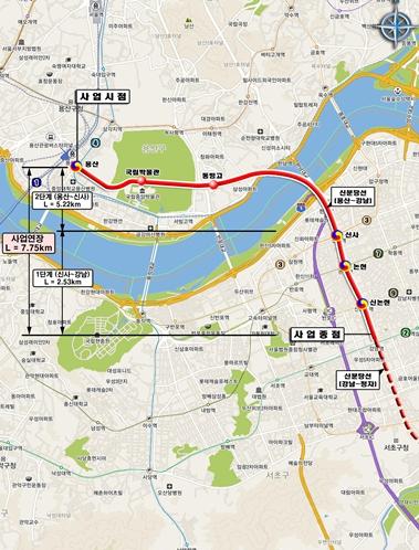 신사~용산까지 총 5.3km 구간은 미군기지 반환 이전에 정거장 개착공사 등을 할 수 있도록 대안노선을 마련하고 있으며, 국방부·미군·국립중앙박물관 등 관계기관 협의를 거쳐 올해 안에 최종 노선을 확정할 계획이다.