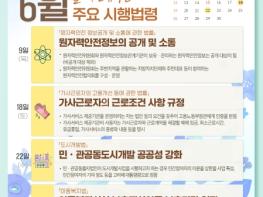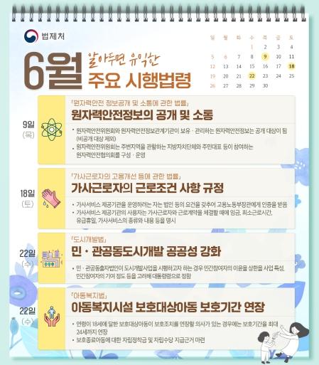 법제처는 6월에 총 116개의 법령이 새로 시행된다고 밝혔다. 주요 시행법령의 내용과 시행일은 다음과 같다.
