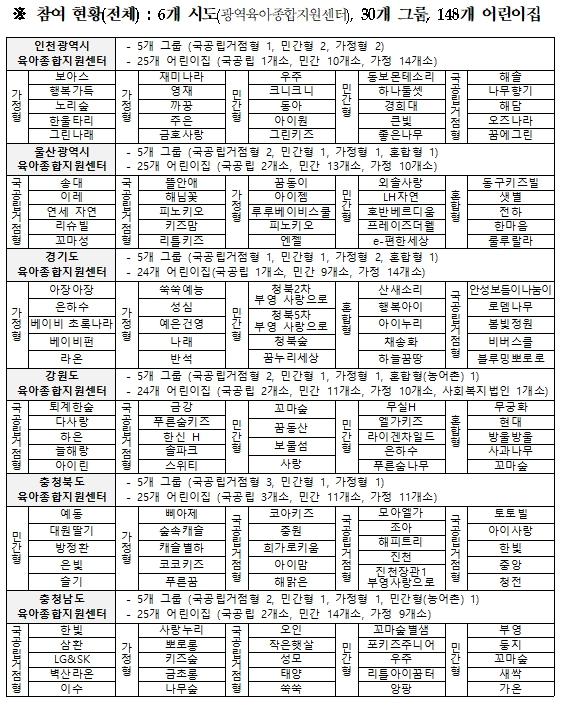 ‘다가치 보육 어린이집 협력사업’은 소규모 어린이집 4~5개를 유형별(가정, 민간, 혼합, 국공립 거점)로 하나의 그룹으로 구성하여, 공동(공통, 선택) 프로그램을 운영하는 새로운 어린이집 협력모델이다.