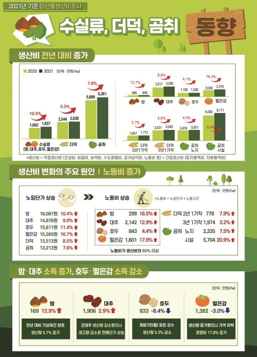 산림청은 지난해 생산된 주요 임산물 7개 품목(밤·대추·호두·떫은감·표고버섯·더덕·곰취)에 대한 임산물생산비조사 결과를 31일 발표했다.