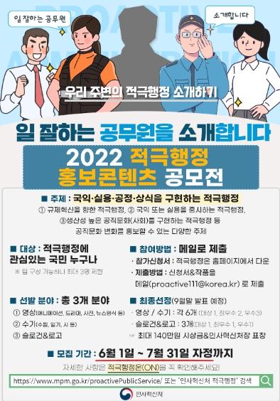 인사혁신처는 6월 1일부터 7월 31일까지 ‘적극적으로 일하는 공무원을 소개합니다’를 부제로 ‘적극행정 홍보콘텐츠 공모전’ 출품작을 접수한다고 31일 밝혔다.