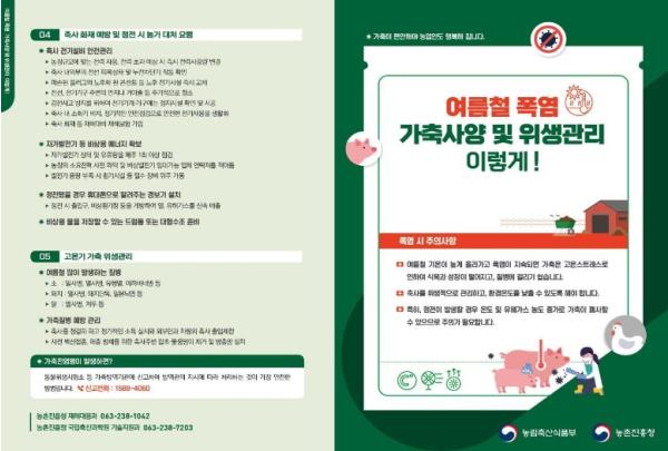 축산농가에서 폭염 대응 기술을 활용할 수 있도록 ‘고온기 가축 피해 예방 및 축사환경관리 핵심기술서’와 ‘여름철 사양관리 및 위생관리 이렇게’ 안내서를 만들어 보급한다.