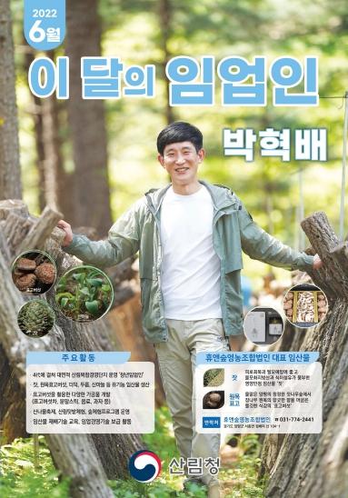 박혁배 씨는 4代째 임업에 종사하는 청년 임업인으로, 잣, 표고버섯, 유기농 임산물을 생산해 높은 소득을 올리고 있다. 또한 지역농협, 스마트스토어, 유기농매장 등 다양한 판로를 개척하여 매출을 올리고 있다.