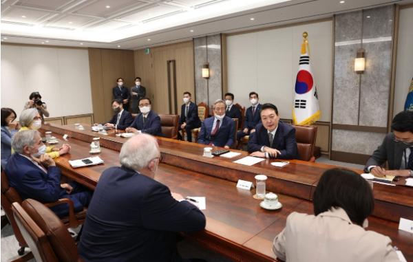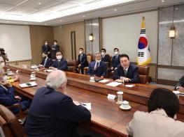 윤석열 대통령이 3일 서울 용산구 대통령실 청사에서 열린 미국 학계 및 전·현직 주요 인사 단체 접견에서 폴 월포위츠 전 미국방부 부장관, 에드윈 퓰너 헤리티지재단 아시아연구센터 회장, 크리스토퍼 델 코소 주한 미국대사 대리 등과 환담을 하고 있다.
