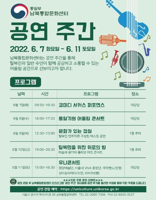 통일부 남북통합문화센터는 누구나 쉽게 남북통합문화를 즐기기 위해 6월 7일(화)부터 6월 11일(토)까지'6월 공연주간'을 개최한다.
