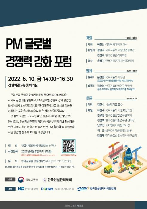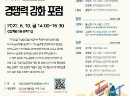 국토교통부는 6월 10일 건설사업관리(PM,Project Management) 산업육성 및 해외 PM 시장 진출방안을 모색하기 위해 관련 업계·기관 간 의견을 교류하는 ‘PM 글로벌 경쟁력 강화포럼‘을 개최할 계획이다.