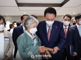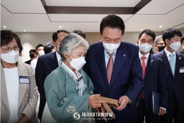 윤 대통령은 오찬 이후 ‘당신의 희생을 잊지 않겠습니다’라는 문구가 적힌 호국영웅 사진 액자를 기념으로 유가족들에게 전달했다.
