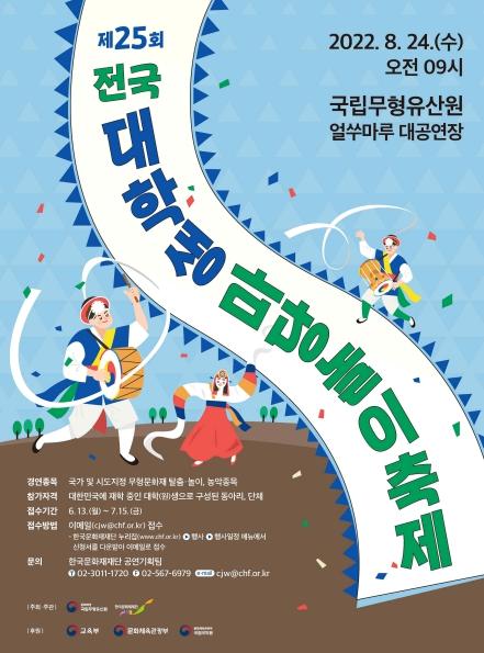 제25회 전국대학생마당놀이축제는 국가 및 시도지정 무형문화재 탈춤과 농악 종목의 경연으로 진행되며, 참가를 원하는 전국의 대학(원)생으로 구성된 동아리 및 단체는 6월 13일부터 오는 7월 15일까지 신청이 가능하다.