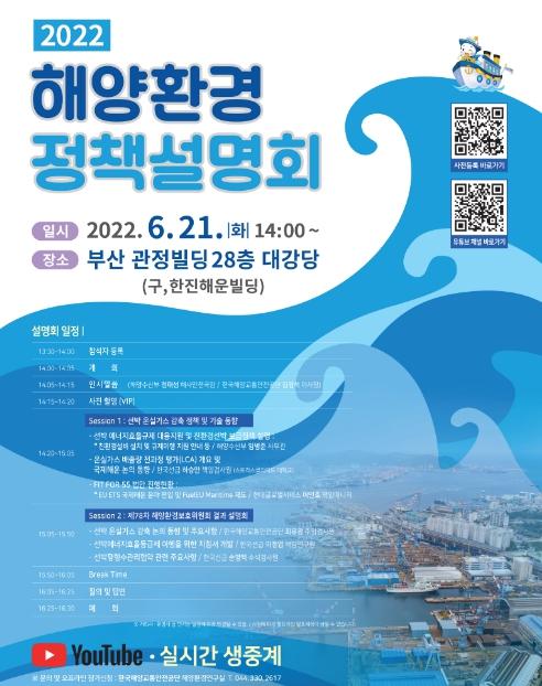 해양수산부는 오는 6월 21일(화) 14시 부산광역시 관정빌딩 28층 대강당에서 ‘2022년 해양환경 정책설명회’를 개최한다.