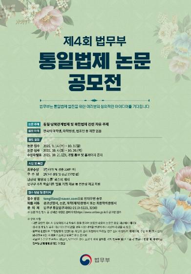법무부는 통일법제에 대한 관심을 환기하고 신진 연구인력을 발굴하고자 ‘제4회 법무부 통일법제 논문 공모전’을 개최한다고 밝혔다.