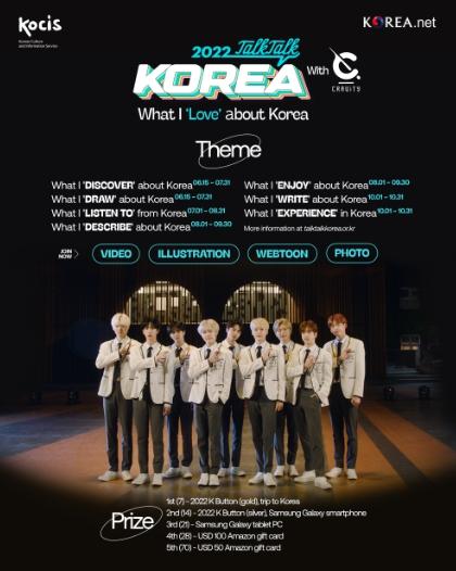 문화체육관광부 해외문화홍보원은 6월 15일 오전 10시 30분, 코시스센터(한국프레스센터 10층)에서 9인조 케이팝 그룹 크래비티(CRAVITY, 스타쉽 엔터테인먼트)를 ‘2022 한국문화 해외 홍보대사’로 선정하고, 위촉장을 수여했다. ‘크래비티’는 앞으로 해문홍이 개최하는 ‘2022 국제 콘텐츠 공모전(Talk Talk Korea 2022)’ 홍보를 시작으로 우리 문화를 전 세계에 알리는 다양한 활동에 참여할 계획이다. 이번 위촉식은 코리아넷 유튜브 채널을 통해 생중계했다.