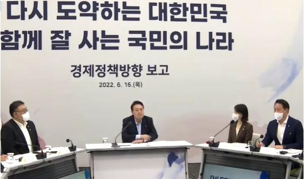 윤 대통령은 “지금 우리 경제가 직면한 국내외 여건이 매우 엄중하다”며 “스태그플레이션의 공포가 엄습하고 있으며 복합 위기에 우리 경제와 시장이 불안해하고 흔들리고 있다”고 진단했다.