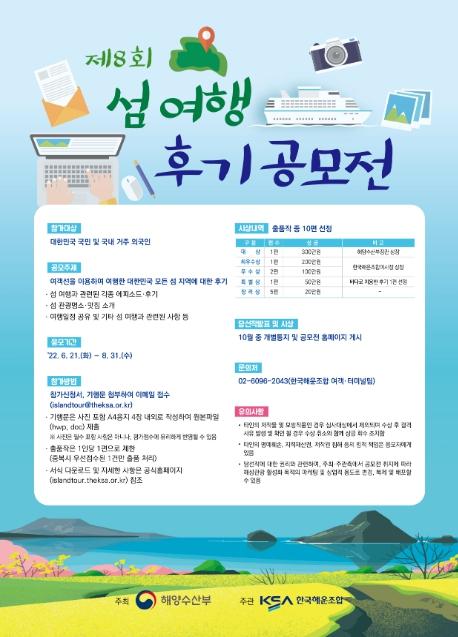 해양수산부는 연안여객선을 타고 떠나는 섬 여행에 대한 국민들의 관심을 높이고 해양관광을 활성화하기 위해 ‘2022 섬 여행 후기 공모전’을 개최한다.
