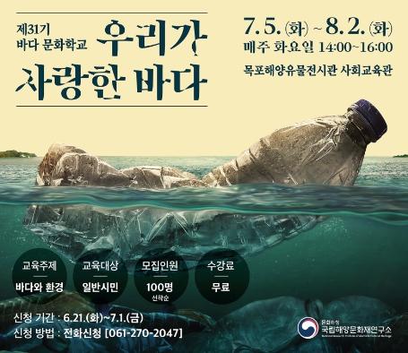 ? 문화재청 국립해양문화재연구소는 6월 21일부터 7월 1일까지 목포해양유물전시관에서 운영하는 '제31기 바다문화학교(7.5.~8.2.)' 수강생을 모집한다.