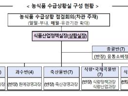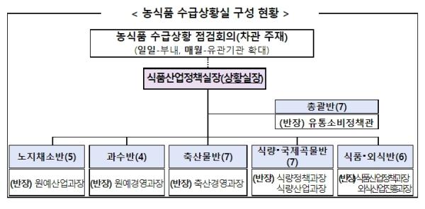 '농식품 수급상황실'은 농식품부 식품산업정책실장을 상황실장으로 하여 총괄반과 품목별 5개반(노지채소반, 과수반, 축산물반, 식량·국제곡물반, 식품·외식반)으로 구성되었다.