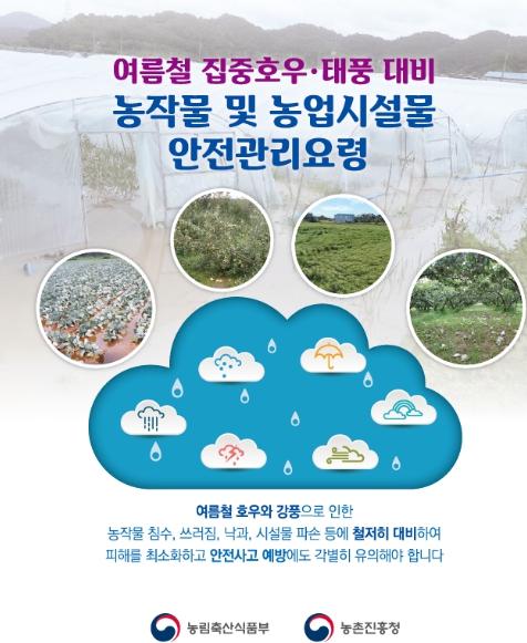 농식품부는 우선 태풍 내습 등 본격적인 재해 발생 전까지 모든 관계기관의 재해 대비 태세(응급복구 장비 점검, 기반시설 점검, 비상연락망 정비 등 기관별 재해대책 등)을 점검·보완하고, 여름철 재해대책상황실을 운영(5.15~10.15)하여, 24시간 상황관리, 기관 간 공조 체계 유지, 피해 발생 시 신속한 응급복구 등 본격적인 재해대응태세를 갖춘다고 밝혔다.