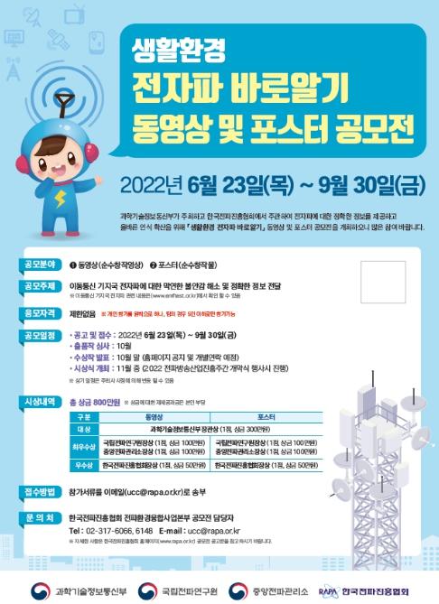과학기술정보통신부는 이동통신 기지국 전자파에 대한 정확한 정보 제공과 대국민 인식 개선을 위한 ‘생활환경 전자파 바로알기’ 동영상?포스터 공모전을 6월 23일부터 9월 30일까지 개최한다고 밝혔다.