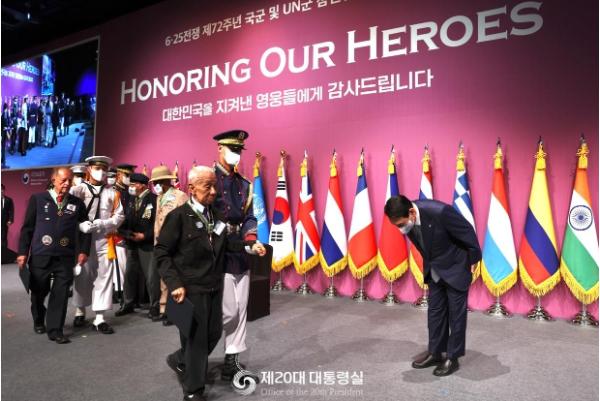 윤석열 대통령은 6?25전쟁 72주년을 하루 앞둔 오늘, 신라호텔 다이너스티홀에서 국군 및 유엔군 참전용사와 후손 200여 명, 유엔 참전국 외교사절과 한미 軍 주요 지휘관 등을 초청해 오찬을 함께 했다.