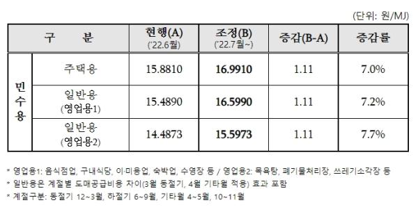 이번 요금 인상에 따라, 주택용 요금은 현행 메가줄(MJ) 당 15.88원에서 1.11원 인상된 16.99원으로, 일반용(영업용1) 요금은 16.60원으로 조정된다.