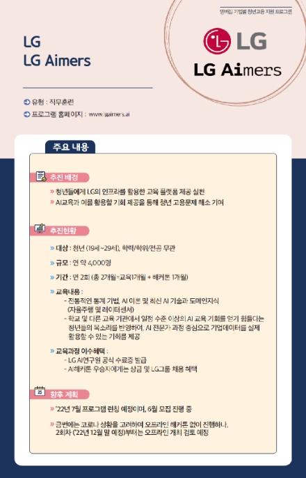 ‘LG 에이머스(Aimers)’는 LG가 인공지능(AI) 분야 교육 경험과 기술을 바탕으로 연간 4천 명 이상의 청년 인공지능(AI) 인재 양성을 위해 신설한 프로그램으로,