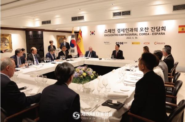윤석열 대통령은 30일 정오 (현지기준) 대한무역투자진흥공사(KOTRA)와 스페인 상공회의소, 기업인 연합회, 무역 투자 공사가 공동 주최한 스페인 경제인과의 오찬 간담회에 참석했다.