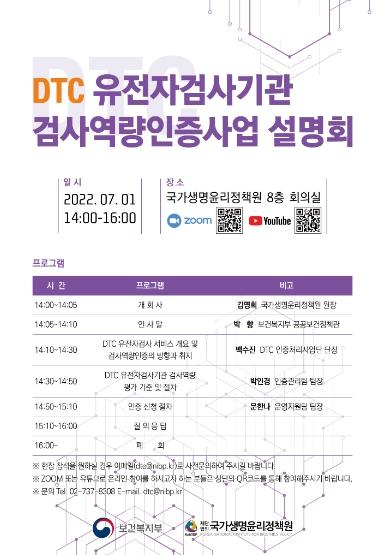 보건복지부와 국가생명윤리정책원은'소비자 대상 직접 시행(DTC) 유전자검사역량 인증제'설명회를 7월 1일 오후 2시 국가생명윤리정책원(8층 회의실, 서울특별시 중구 다동)에서 개최한다고 밝혔다.